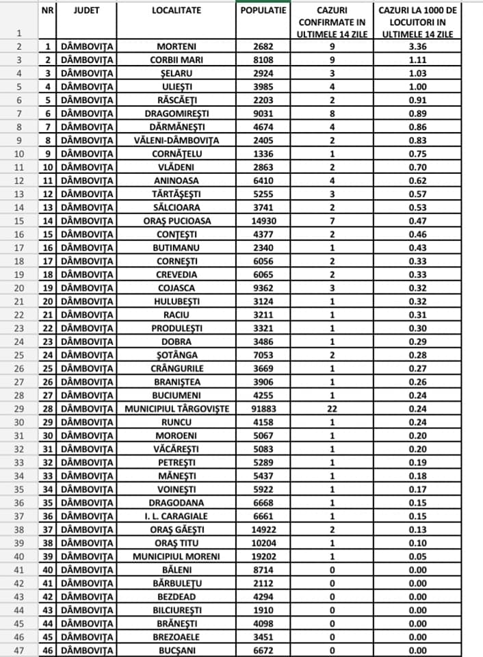 Cazurile noi sunt ca urmare a analizei unui număr de aproximativ 40.000 de teste. Dintre cazurile noi, 13 sunt în județul Dâmbovița, unde rata de incidență crește la valoarea de 0,22 la mie. Cea mai mare incidență din Dâmbovița este la Morteni (3,26 la mie, practic în scenariul roșu de funcționare).