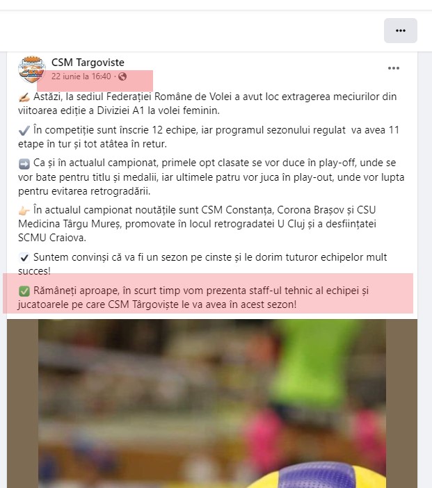 În urma unor articole mincinoase și tendențioase apărute in spațiul media, facem următoarele precizări: echipa de volei a Clubului Sportiv Municipal Târgoviște s-a înscris în sezonul 2023-2024 al Campionatului Național de Volei Feminin încă din luna Iunie 2023.