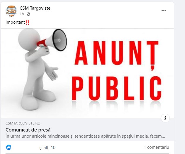 Ne-am dori ca știrile eronate să nu mai ajungă în societate, nu le putem opri, însă vă putem asigura de transparența pe care Clubul Sportiv Municipal Târgoviște o va avea întodeauna.