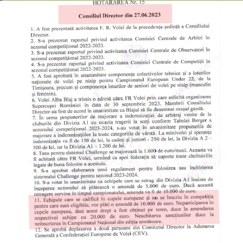 Totodată, conform hotărârii Federației Române de Volei, al Consiliului Director din 27.06.2023, precizăm că amendarea pentru neînscrierea în cupele europene se va pune în practică pentru echipele eligibile începând cu sezonul anului viitor, mai exact, 2024-2025.