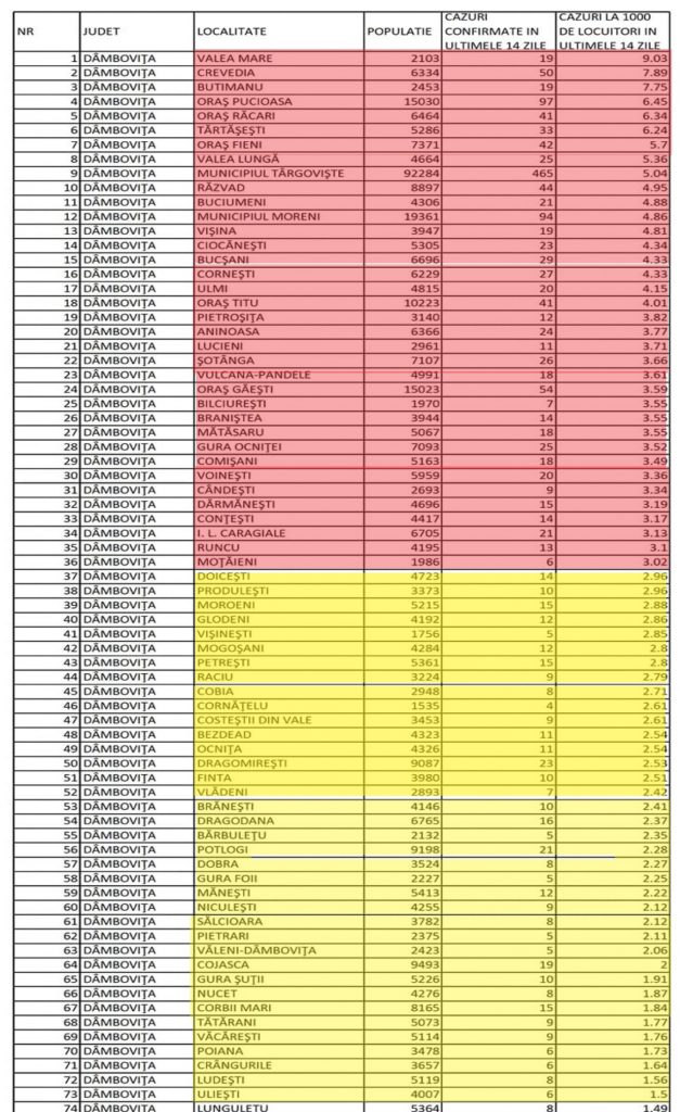 Pe de altă parte, în unele județe, precum Dâmbovița, Prefectura anunță zilnic (de o vreme) statistica actualizata pentru fiecare localitate (o analiză cumulativă la 14 zile), dar, în ceea ce privește celelelate informații, în Dâmbovița, spre deosebire de județul Argeș, situația locurilor de la ATI (covid) sau numărul de teste efectuate zilnic nu sunt făcute publice de autorități: