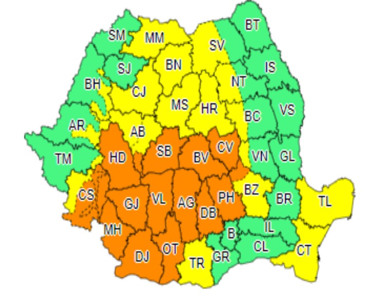 În Oltenia, nordul și nord-vestul Munteniei, sudul Banatului, precum și în jumătatea de sud a Transilvaniei vor fi intervale cu averse torențiale, frecvente descărcări electrice, intensificări puternice ale vântului, vijelii și grindină.În intervale scurte de timp sau prin acumulare, cantitățile de apă vor depăși 35…40 l/mp și pe arii restrânse 50…70 l/mp.