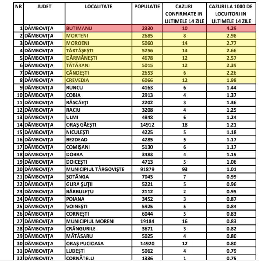 Iată și un exemplu mai concret. În județul Dâmbovița, în ultimele zile, incidențele au crescut constant, astfel că în momentul de fată, 18 septembrie, sunt nu mai puțin de 9 localități unde incidenta a trecut de 1,5 la mie. Cea mai mare comunitate, Târgoviștea, a “sărit” de 1 la mie, dar din punct de vedere al restricțiilor, sau măsurilor, mai nimic nu se întâmplă ( n.m. datele sunt valabile pentru ziua de 18 septembrie 2021). În nu mai puțin de 71 de localitati, dintr-un total de 89 din judetul Dâmbovița, se înregistrează cazuri active de îmbolnăvire, în ultimele 14 zile ( calculat pentru ziua de 18 septembrie). Click download, mai jos, pentru situația completă din județul Dâmbovița.