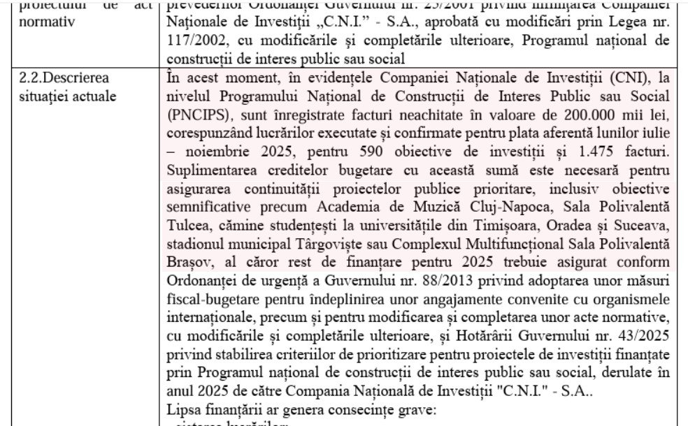 În data de 23 decembrie 2023, în ultima ședință de Guvern (probabil) din 2025, s-a decis scoaterea din fondul de rezervă a sumei de 200 de milioane de lei. Banii vor merge către CNI (Compania Națională de Investiții), pentru plata unor facturi neachitate, se spune.