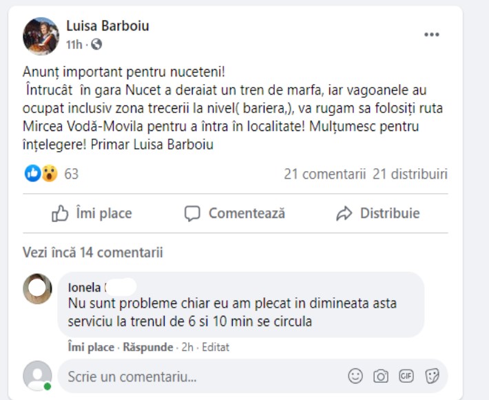 În noaptea de 27 august 2021, în mica comunitate de la Nucet, din Dâmbovița, un mesaj inducea panică: Un tren a deraiat în gara din localitate. Mesajul era postat, pe o rețea de socializare, chiar de primarul localității: