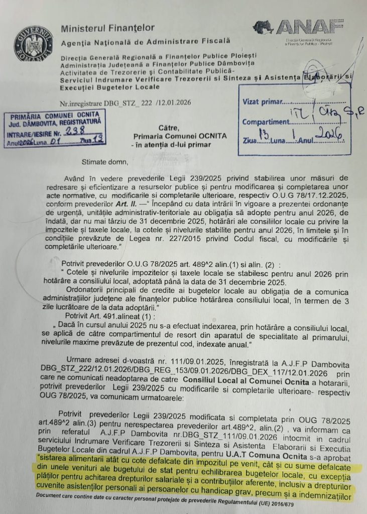 La Ocnița, deși ar fi fost obligatoriu, nici până la acest moment, adică 13 ianuarie 2026, nu a fost votat cuantumul nou al taxelor și impozitelor locale, așa cum a fost stabilit el de Guvern. Cuantumul taxelor și impozitelor locale (minim, maxim sau intemediar), unul în concordanță cu normele stabilite de Guvern, ar fi trebuit aprobat, în consiliul local, până la data de 31 decembrie 2025. Ulterior, hotărârea de consiliu ar fi trebuit comunicată ANAF, pentru ca să fi stabilite și sumele ce revin, de la Stat, către bugetul local.