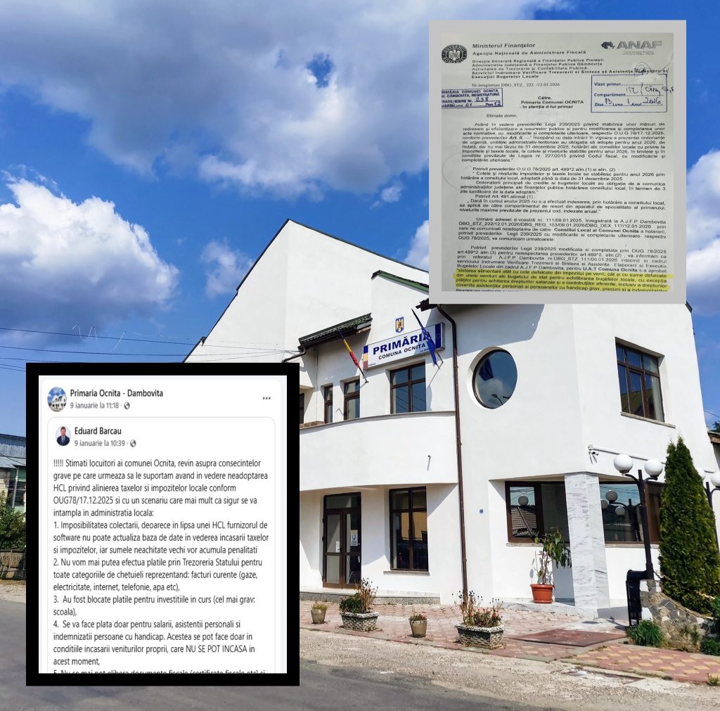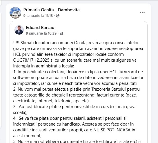 –“Nenorocire!”, strigă, acum, primarul PSD de la Ocnița, Eduard Barcău, ce anunță că prin neaprobarea cuantumului, pentru 2026, a taxelor și impozitelor locale, comuna rămâne fără bani!