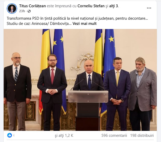 Trecând și peste asta, prim-vicele de la PSD Dâmbovița, Titus Corlățean, un om politic ce nu are cum să fie foarte fericit de actuala conducere a PSD (una ce i-a cam refuzat niște demnități, unele la care Titus Corlățean năzuiește de ceva vreme) anunță, deja, că PSD-ul ar cam trebui să iasă de la guvernare. Bine, având în vedere lipsa de asumare a PSD , dar și faptul că, până acum, în Guvernul Bolojan, nu a cam produs nimic în materie de guvernare, termenul corect ar fi fost că: Titus Corlățean anunță că PSD-ul NU ar trebui să intre la guvernare.