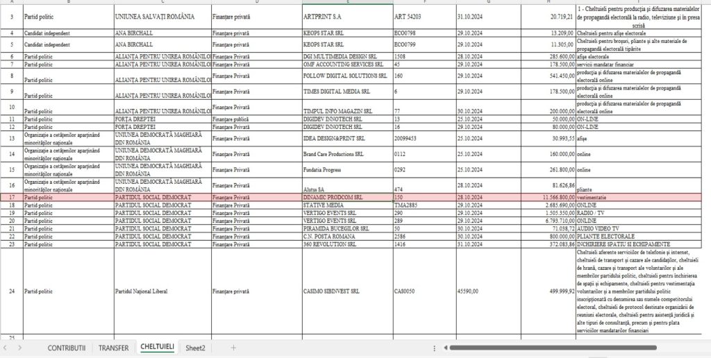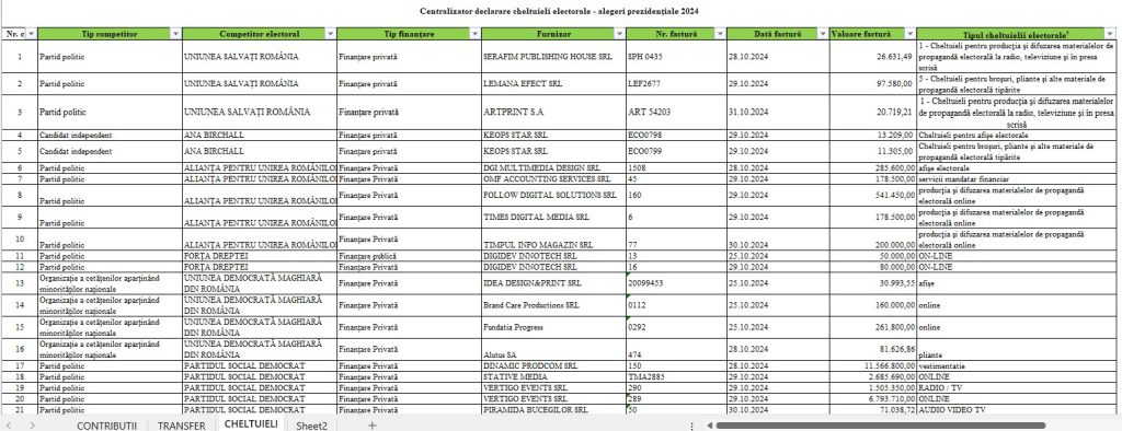 Cum doar pentru “prezidențiale” există date disponibile, momentan (la capitolul cheltuieli) iată, așadar, cum se prezintă acestea, datele fiind, după cum aminteam, doar o poză a momentului, nicidecum unele finale (click, mai jos, pe download, pentru lectura completă a tuturor cheltuielilor din campania electorală pentru prezidențiale).