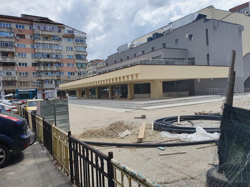 Centrul orașului- “Piața Tricolorului”, reabilitată în anul 2020. Fântânile, din cadrul proiectului de reabilitare, nu au funcționat decât la inaugurare, în iarna 2020. Acum este iunie (9 iunie 2021)