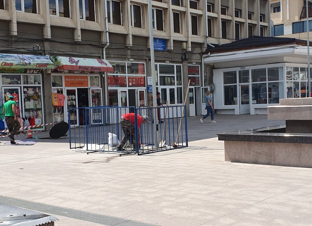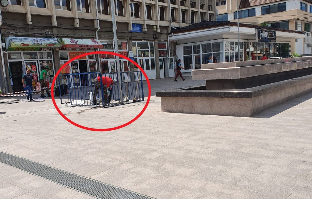 Se lucrează, se sparge granitul, așezat, în cadrul proiectului de reabilitare, în urmă cu jumătate de an. Probabil că garanția lucrării a avut un termen de viață extrem de scurt. De fapt, cred că tot cu fântânile are legătură și “procesul” de deconstrucție, surprins în imagini.