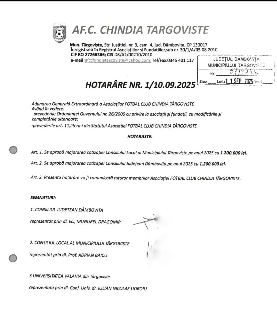 Foto: Document prin care se solicită majorarea cotizației la AFC Chindia Târgoviște, în 10 septembrie 2025 (cuantumul total al cotizației este de 3,8 milioane de lei, în anul 2025). De remarcat că cererea este făcută în numele CJ Dâmbovița, Primăria Târgoviște și Universitatea “Valahia”, în conditțile în care Universitatea “Valahia” a fost îndepărtată din structura de asociați, încă din luna iulie 2025, iar documentul este datat 10 septembrie 2025