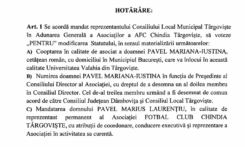 Tot obligatoriu de remarcat este și că, conform documentului amintit anterior, în continuare, în acte, la capitolul asociați ai AFC Chindia, apar Primăria Târgoviște, CJ Dâmbovița și Universitatea “Valahia“, iar asta în ciuda faptului că încă din iulie 2025 se votase (ședințe ale cons.local municipal Târgoviște și CJ Dâmbovița) ieșirea din Asociația FC Chindia a Universității “Valahia” și înlocuirea acestui asociat cu Iustina Pavel (o entitate privată, soția lui Marius Pavel, președintele din acte al AFC Chindia, acum).