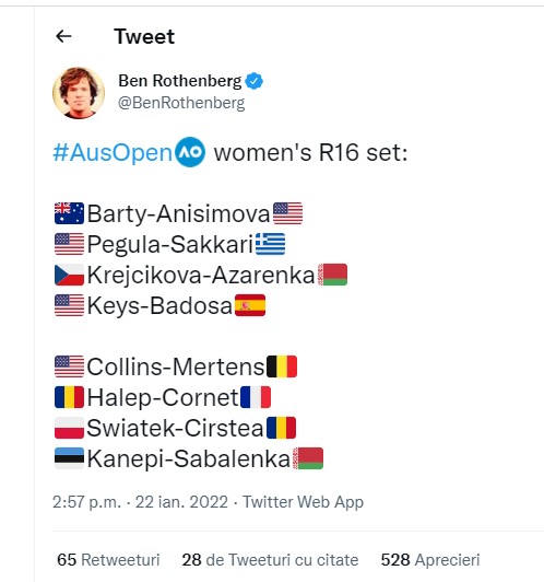 În acest mod, România reușește, doar pentru a treia oară în istoria turneelor de Mare Slem, să ajungă cu două sportive în faza optimilor de finală, în același timp.