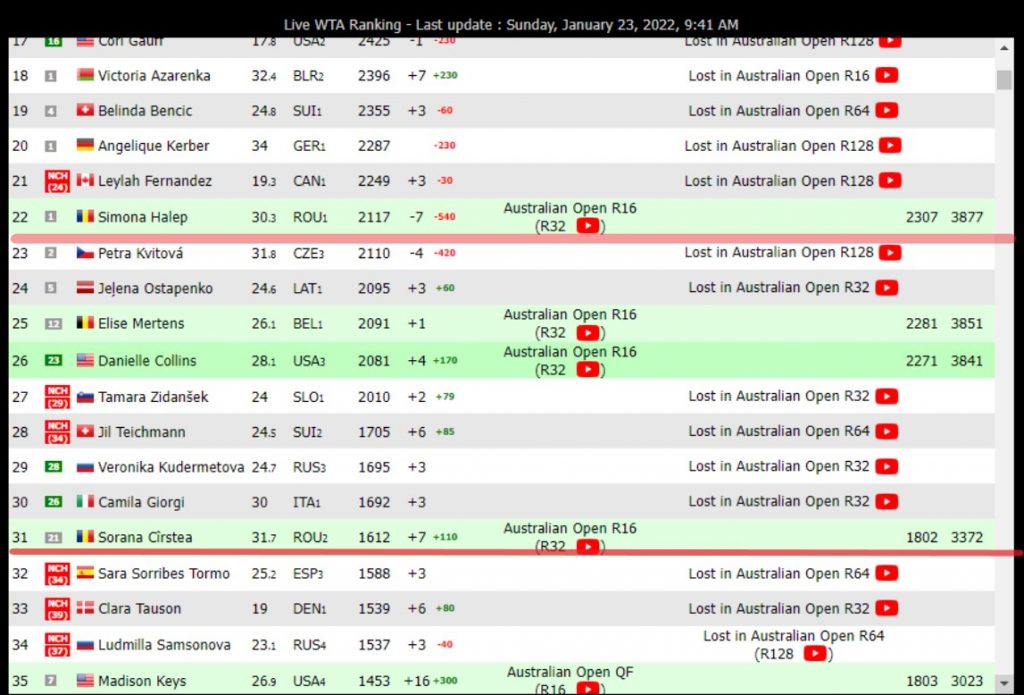 De altfel, Sorana bifează un salt important în clasamentul WTA la zi, urcând 7 poziții, până pe locul 31. De celalaltă parte, Simona Halep, deși s-a calificat la rândul său în “optimi”, este în cădere 7 poziții, în clasamentul WTA. Asta pentru că Simona are de apărat semifinala de la AO 2020 ( așa se face calculul punctelor în perioada pandemică, în 2021 s-a luat în considerare cel mai bun rezultat obținut în ultimii doi ani). Cu alte cuvinte, Halep “are nevoie “de finală pentru a acumula puncte în plus și a urca în clasament.