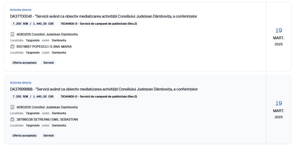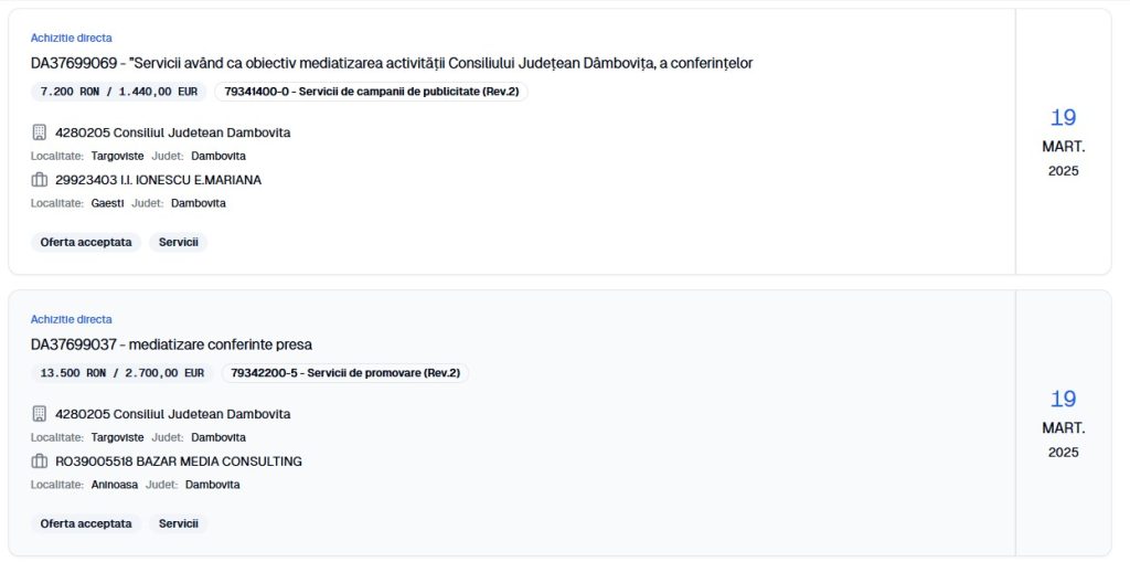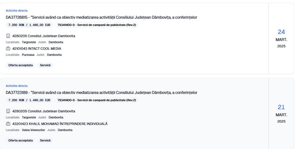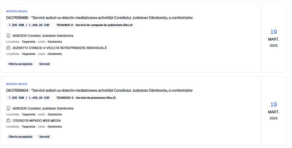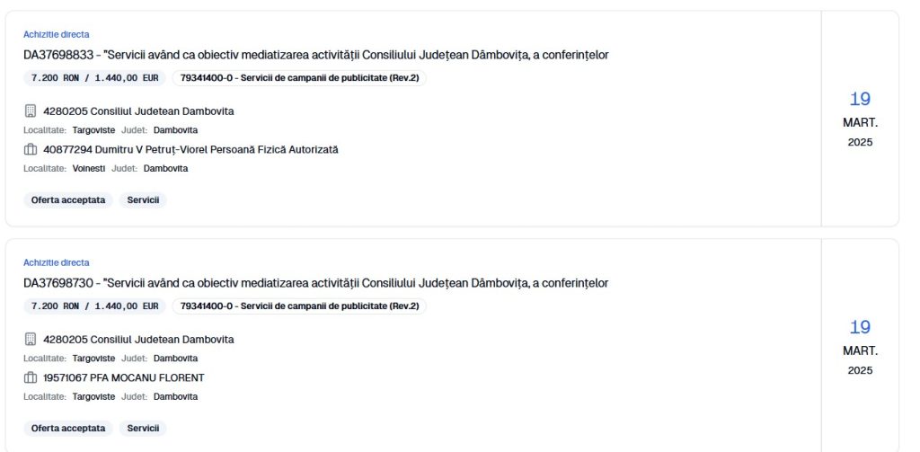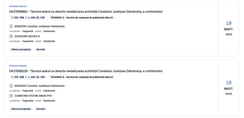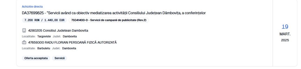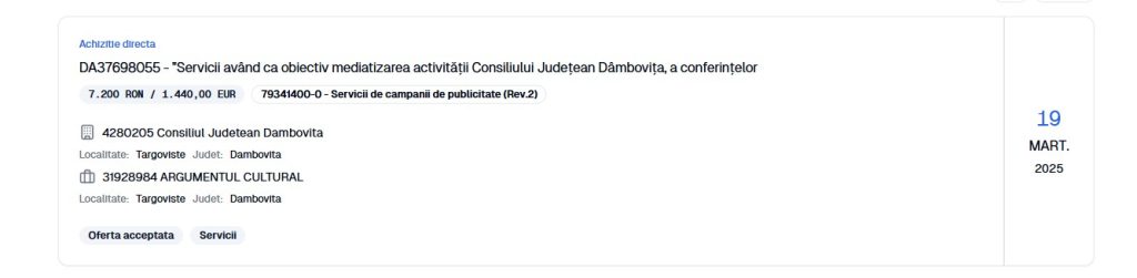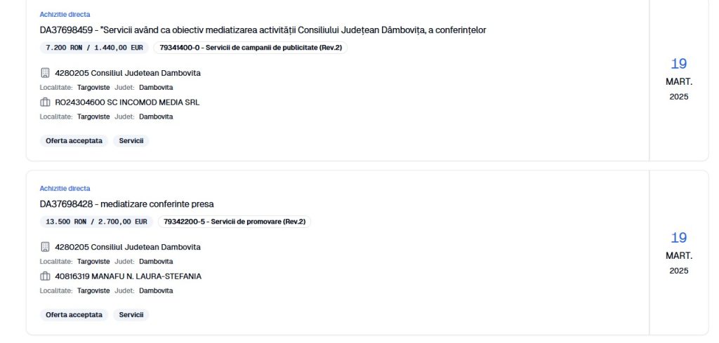 Dincolo de sume (adevărat, nu unele extraordinare), dar și de caracterul legal sau moral al “gestului” celor de la CJ Dâmbovița (mai ales în actualul context socio-economic), am considerat important, pentru publicul dâmbovițean în primul rând, a prezenta, măcar, (fără alte comentarii) aceste contracte, așa cum apar ele menționate în SICAP (sistemul electronic de achiziții publice), iar asta pentru că, din rațiuni ce țin deja de domeniul evidenței, nu vor putea fi regăsite în altă parte (în segmentul media dâmbovițean).