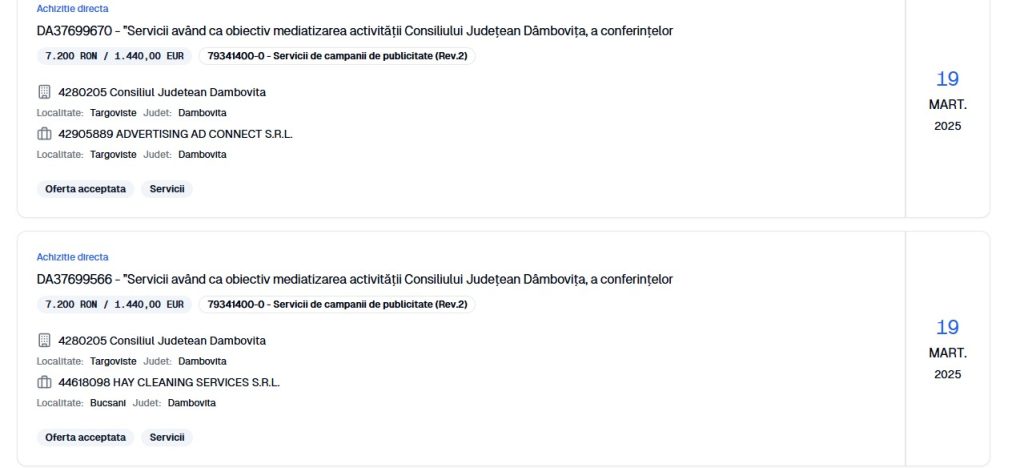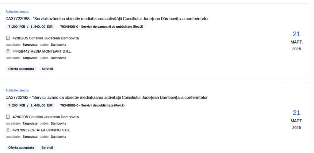 Menționând totodată că este vorba de achiziții directe, deci nu de vreo licitație sau un concurs de oferte (cu criterii clare și obiective asumate, în urma contractului). Toate aceste contracte au ca durată anul 2025 (perioada aprilie-decembrie, adică 9 luni.