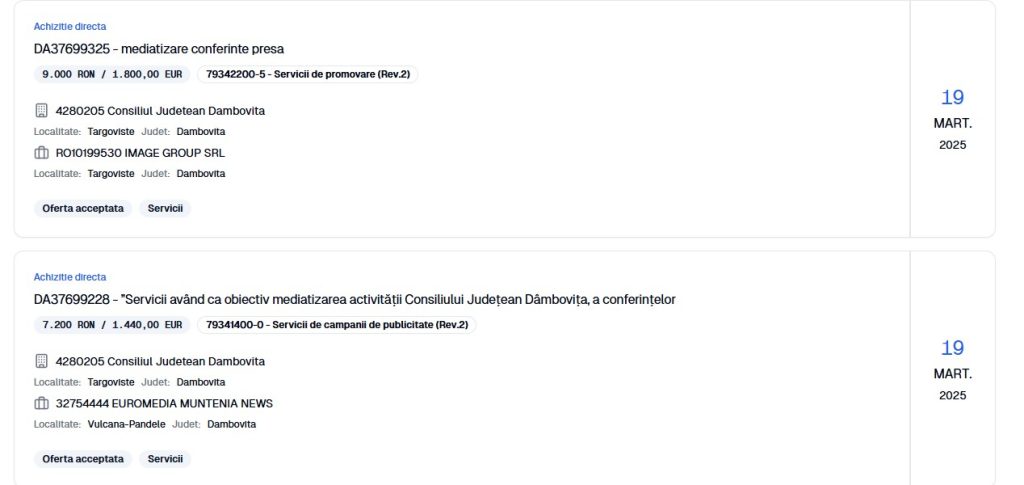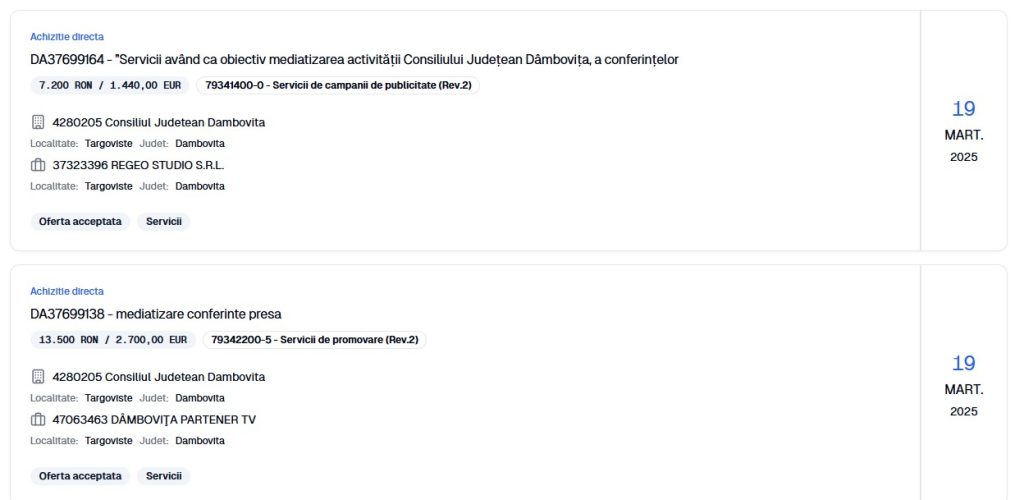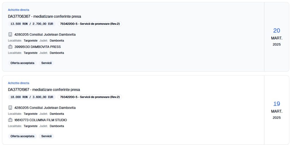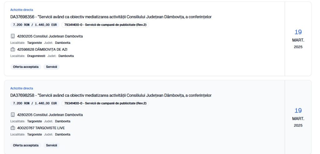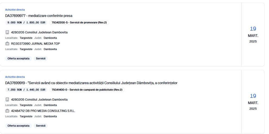 Consiliul Județean Dâmbovița și-a păstrat, și în 2025, obiceiul de a aloca discreționar (și fără sens, în multe cazuri) fondurile publice, un obicei pe care îl perpetuează de ani buni deja. Instituția va aloca, în 2025, cel puțin 50.000 de euro, pentru publicare în presa locală, din Dâmbovița, de anunțuri ședințe ale CJ, dar și conferințe de presă organizate de conducerea instituției. Nu mai puțin de 32 de instituții (media se spune, în fapt II-uri, PFA-uri și SRL-uri, cele mai puține, acestea din urmă) au fost cadorisite, de CJ Dâmbovița, în a doua jumătate a lunii martie 2025, cu contracte ce au valori cuprinse între 1440 euro și 3600 de euro.