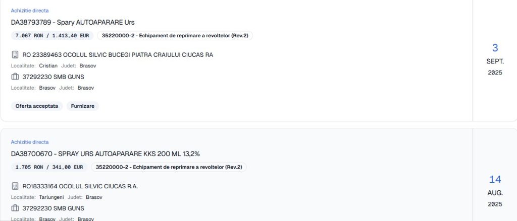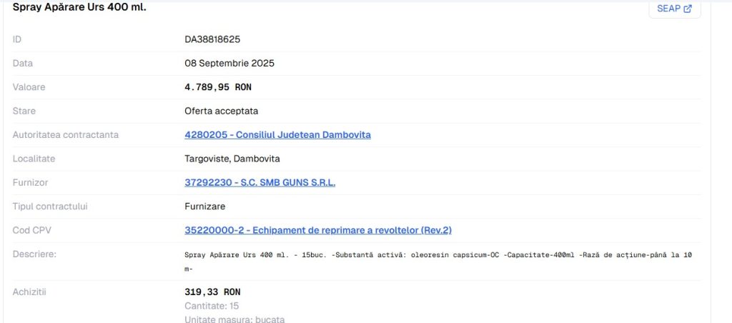 Cu toate acestea, CJ Dâmbovița a decis să achizitioneze nici mai mult decât 15 dispozitive de apărare (antirevoltă), unele eficiente și împotriva ursilor, după cum scrie în fișa de descriere a produsului.