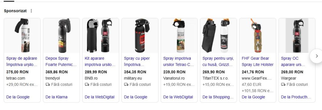 Foto: Captură internet, spray-uri anti-urs, rezultate returnate de browser-ul google, la o căutare după acest produs
