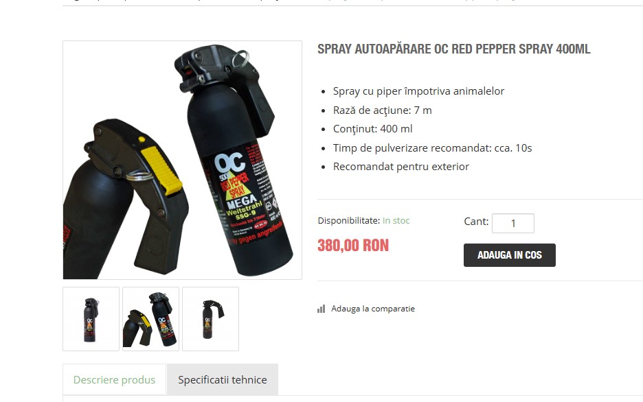 Foto: Model spray anti-urs achiziționat de CJ Dâmbovița (prețul din imagini este cel anunțat pentru publicul general, firma ce a realizat contractul cu CJ Dâmbovița dând probabil și un discount, pentru o achiziție mai mare, precum cea a CJ Dâmbovița).