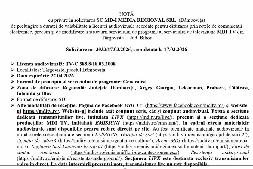 Suplimentar, activitatea postului va fi monitorizată mai intens, în lunile următoare, inspectorul zonal al celor de la CNA având în sarcină a urmări transpunerea în fapte a celor declarate (asumate) de conducerea postului tv cu sediul în Târgoviște. Astfel, monitorizarea strictă se va face pe o perioadă de 3-4 luni, începând din aprilie 2026, la finalul acestui interval, cei de la MDI TV, urmând a reveni în fața celor de CNA, pentru o analiză.