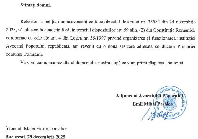 În acest sens, orice solicitare, eventuală, de drept la replică, a administrației publice de la Comișani, în acestă speță, va fi publicată în acest material (ulterior). Totodată, aceste rânduri constituie și o invitație la un punct de vedere, al administrației de la Comișani, în acest caz.