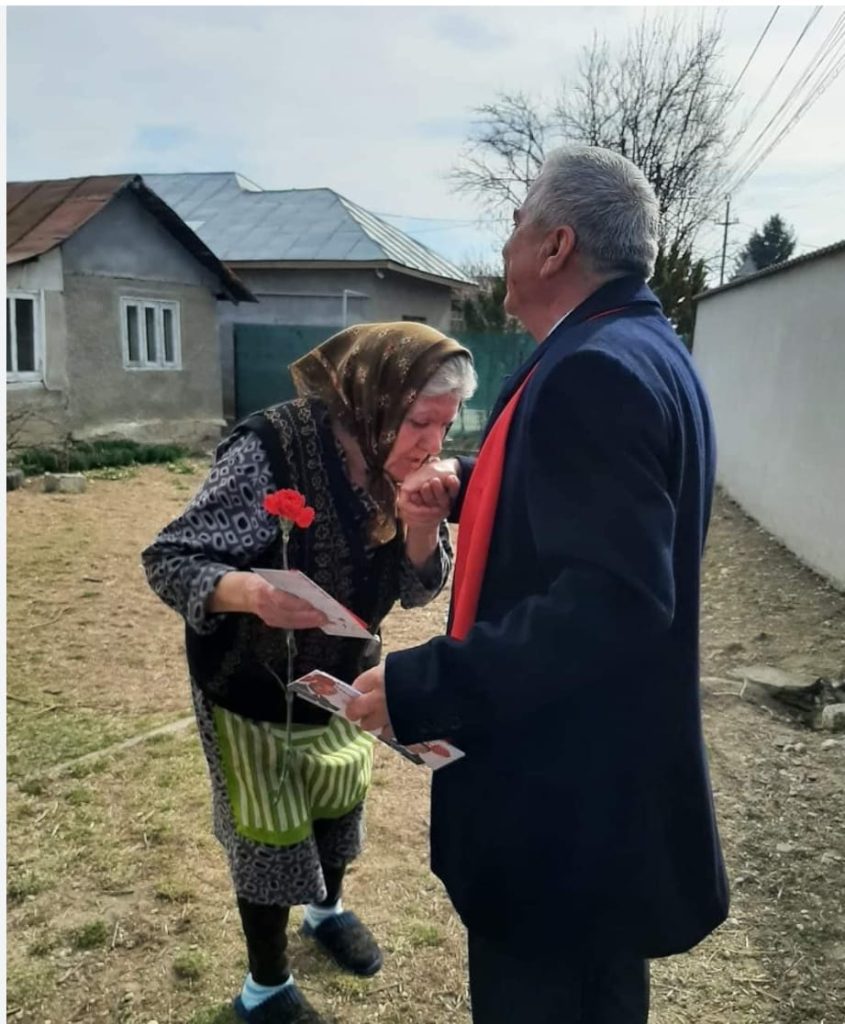 Foto: Ion Bătrânu, primar Comișani, județ Dâmbovița, stă să i se pupe mâna, de o bătrână, după ce i-a oferit o floare, de 8 martie. Fotografia a apărut, inițial (în data de 8 martie 2023), pe contul de facebook al edilului, ulterior aceasta fiind ștearsă