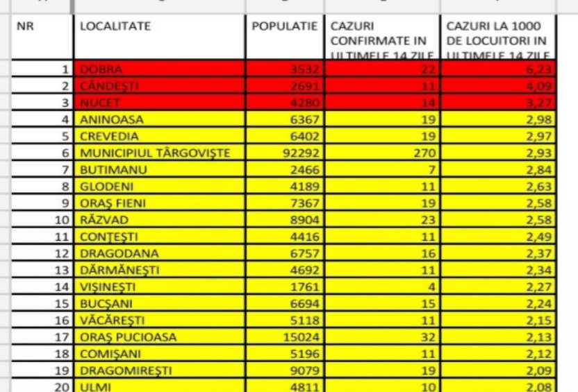 În alta ordine de idei, în Dâmbovița, la momentul actual ( 23 octombrie mai exact), erau 3 localități cu o incidentă mai mare de 3 cazuri la mie, respectiv Dobra, Cândești și Nucet ( vezi foto mai sus). La Aninoasa, Crevedia sau Târgoviște rata fiind foarte apropiată de această limită. La Târgoviște fiind o rata de 2,93, în condițiile în care cu o zi înainte aceasta era de 2,97.