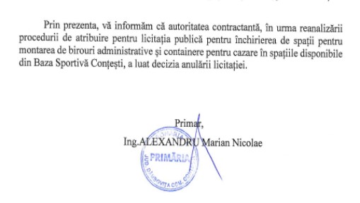 Conform informațiilor existente, licitația pentru închirierea bazei sportive din localitatea Conțești, pentru realizarea acestui amplasament de șanteir, va fi reluată. Rămâne de văzut sub ce formă și dacă, la proxima încercare, va fi și cu respectarea legii (a legilor mai corect spus).