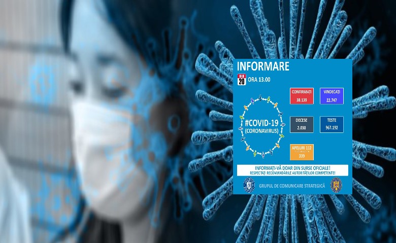 Până astăzi, 20 iulie, pe teritoriul României, au fost confirmate 38.139 de cazuri de persoane infectate cu noul coronavirus (COVID – 19). Dintre persoanele confirmate pozitiv, 25.213 au fost externate, dintre care 22.747 de pacienți vindecați și 2.466 de pacienți asimptomatici, externați la 10 zile după depistare.