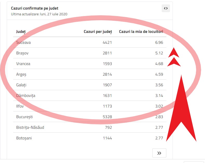 De departe se distinge, negativ, județul Dâmbovița (131 de cazuri noi într-o singură zi). Spre comparație, sunt mai multe cazuri într-o singură zi, în DB, față de câte au fost înregistrate într-o lună întreagă, în perioada de stare de urgență. DB se situaeză pe locul 2 pe țară (clasament aferent zilei de 27 iulie) la numărul de cazuri noi, după București (167 de cazuri). Peste 100 de cazuri au fost înregistrate, în ultimele ore, și în județele AG,BV și PH. Conform datelor, județele DB și IF au trecut de pragul de 3/1000 (cazuri la mia de locuitori), intrând în așa numită zonă roșie a infectării cu coronavirus.