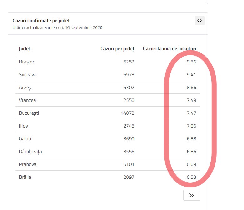 Din altă perspectivă, Brașovul a ajuns pe primul loc la nivel național (9,56 cazuri la mia de locuitori), urmat de județele Suceava (9,41) și Argeș (8,66 cazuri la mia de loc.). Bucurestiul, cu cele 14.000 de cazuri înregistrate, este pe un trend ascendent accelerat, iar în scurt timp, și procentual, este de asteptat să ajungă pe primul loc la nivel național, dacă actuala tendință se menține. De remarcat este că judetele cu populatie numeroasă sunt totusi între primele la nivel national (Suceava este al doilea județ din țară, după Timiș, și excluzând Bucureștiul, ca număr de locuitori). De asemenea judetele Argeș și Brasov sunt două dintre cele mai populate județe din țară.
