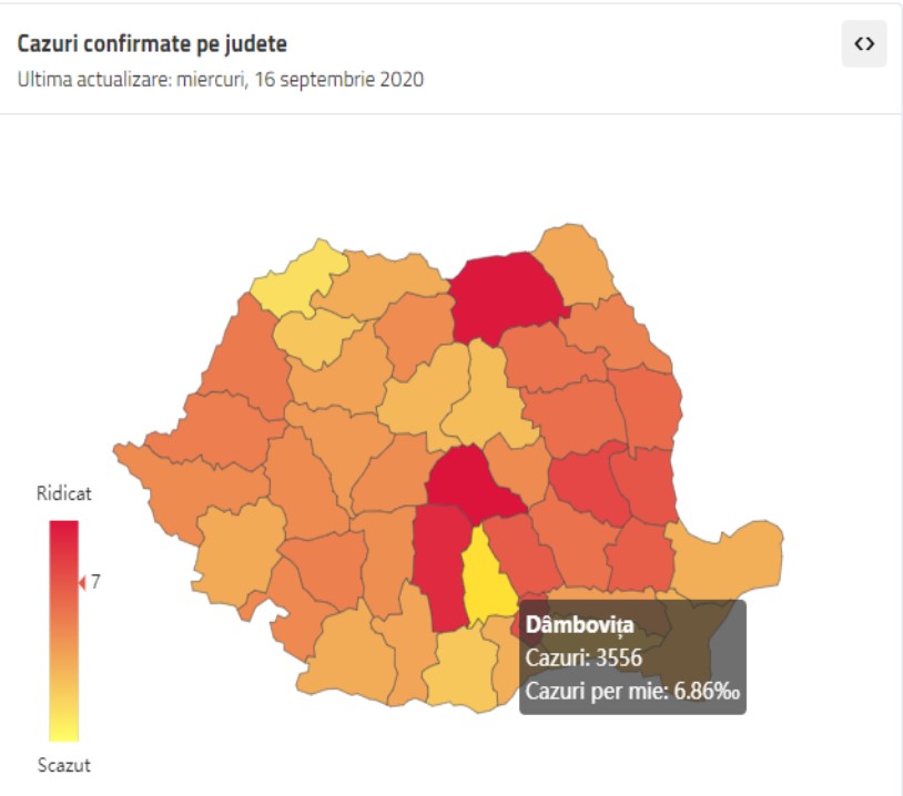Și alte județe, precum Dâmbovița continuă să se mențină la un procentaj ridicat ( cazuri la mia de locuitori) fiind plasate în zona de risc ridicat de îmbolnavire (cazuri active la momentul actual). Rata de îmbolnăvire este în DB, de 6,86 la mia de locuitori.(locul 8 național). Tot în DB, spre exemplu numărul de decese se mentine ridicat, ca și în alte județe din țară. Astăzi, 16 septembrie , în Dâmbovița au fost raportate 32 de cazuri noi si cel puțin un deces. În data de 15 septembrie, în DB, erau, conform statisticii oficiale: