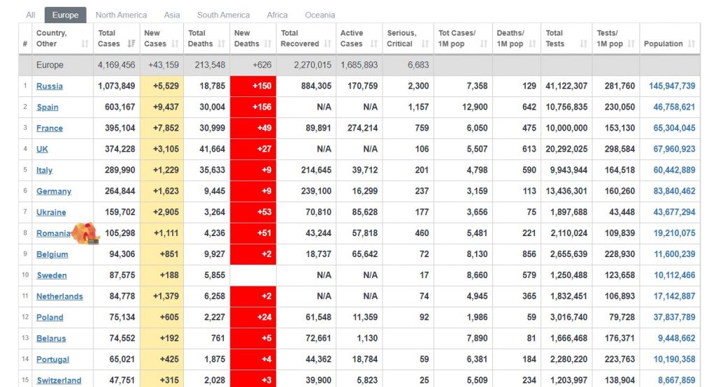 Într-o analiză oficială România figurează pe locul 8 în Europa la numărul de cazuri înregistrate de la debutul pandemiei. În ceea ce privește numărul deceselor (date pentru ziua de 15 septembrie, datele din 16 septembrie nefiind încă integral prelucrate la ora publicarii acestui articol) România se află pe locul 4 în Europa, după Rusia, Spania și Ucraina , foarte aproape de Ucraina, toate țari cu populații mult mai mari decât cea a României. Situația se regăsește aproape identic în fiecare dintre ultimele 14 zile, în ceea ce privește Romănia, ca și număr zilnic de decese. Asta în timp ce, în unele țări, epidemia a luat avânt doar în ultimele zile.