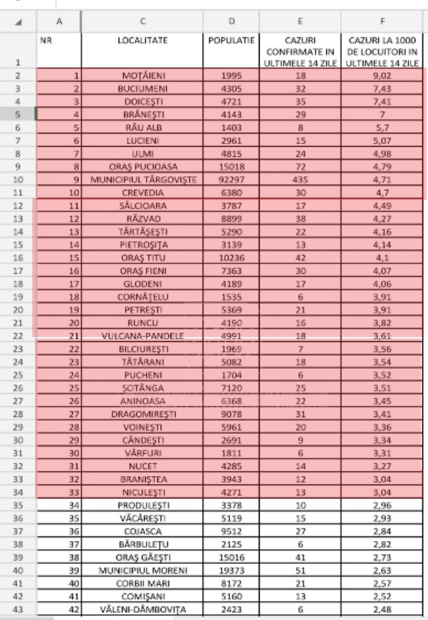 În Dâmbovița (date pentru 11 noiembrie) Buciumeni, Doicești și Brănești erau localitațile aflate la o rată de incidentă de peste 7 la mie, iat Moțăieni la peste 9 la mie (localitate deja carantinată). Momentan, datele pentru 12 noiembrie nu sunt anunțate, dar dat fiind numărul mare de cazuri noi de astăzi (205 în Dâmbovița) este posibil ca indicii să crească și mai mult. Nicio decizia de carantinare nu a fost anunțată momentan de autoritătile din Dâmbovița ( suplimentar fată de Moțăieni, localitate aflată deja în carantină).