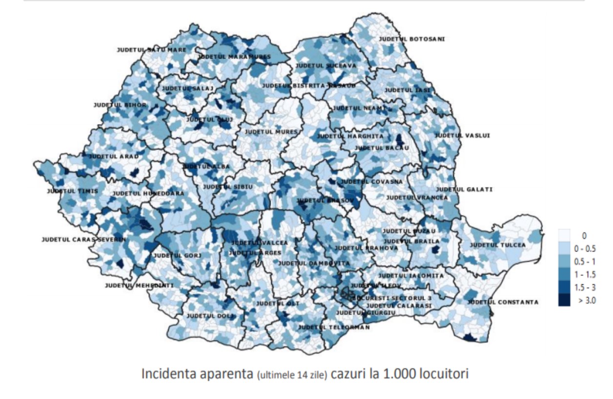• In 11 județe si Municipiul București se înregistrează o rata de incidenta cumulata peste 100/100.000 locuitori.
