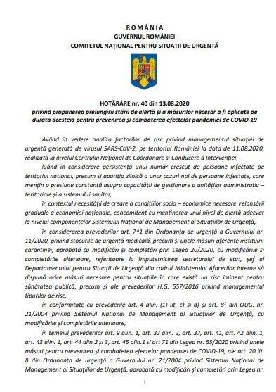 Art.1 Se propune prelungirea stării de alertă pe întreg teritoriul național, pentru o perioadă de 30 zile, începând cu data de 16.08.2020.