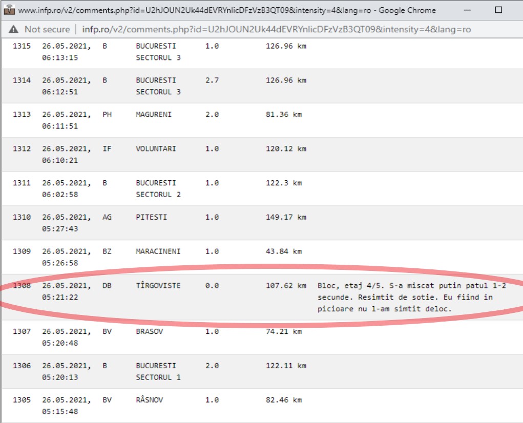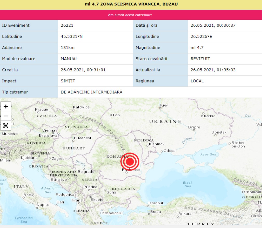 În ziua de 26 Mai 2021, la ora 00:30:37 (ora locală a României), s-a produs în ZONA SEISMICA VRANCEA, BUZAU un cutremur mediu cu magnitudinea ml 4.7, la adâncimea de 131km.