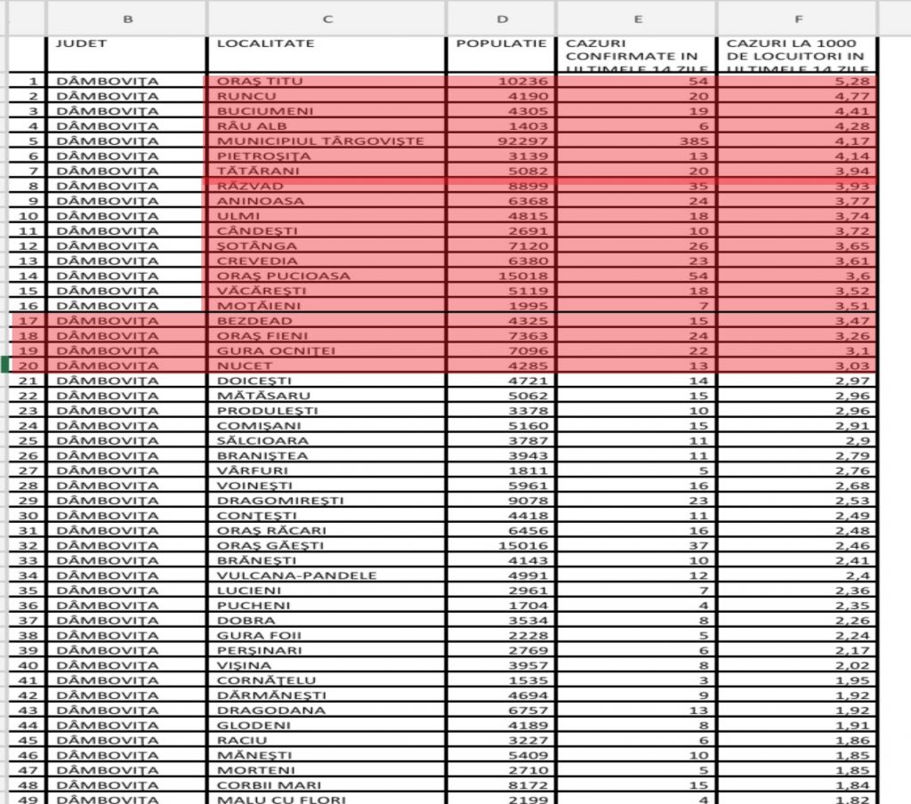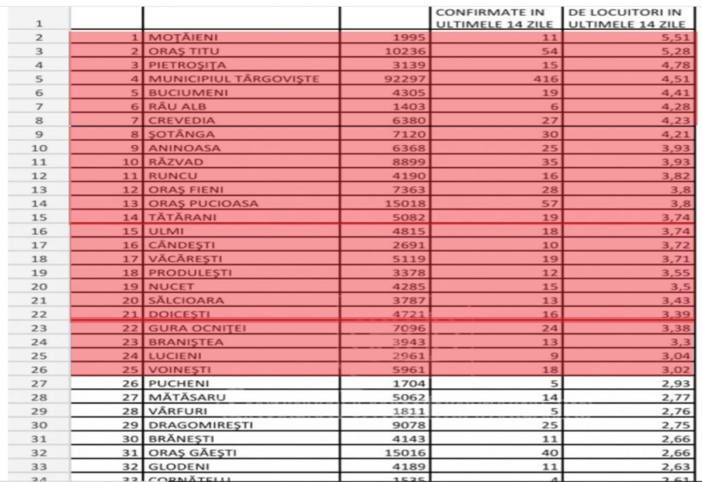 Conform ultimei informări a Direcției de Sănătate Publică Dâmbovița, rata incidenței cumulate în ultimele 14 zile a fost depășită astfel:– peste 5 cazuri/1000 locuitori în 2 unități administrativ-teritoriale,- peste 4 cazuri/1000 locuitori în 6 unități administrativ-teritoriale- peste 3 cazuri/1000 locuitori în 17 unități administrativ-teritoriale- peste 1,5 cazuri/1000 locuitori în 34 unități administrativ-teritoriale