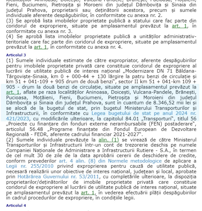 Se aprobă declanșarea procedurilor de expropriere a tuturor imobilelor proprietate privată care constituie coridorul de expropriere al lucrării de utilitate publică de interes național „Modernizare DN 71 Bâldana-Târgoviște-Sinaia, km 0 + 000-44 + 130 lărgire la patru benzi de circulație și km 51 + 041-109 + 905 drum de două benzi“, sector II km 51 + 041-km 109 + 905 – drum la două benzi de circulație, situate pe amplasamentul prevăzut la art. 1, expropriator fiind statul român, reprezentat de Ministerul Transporturilor și Infrastructurii, prin Compania Națională de Administrare a Infrastructurii Rutiere – S.A.