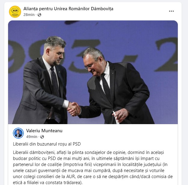 Sursa foto: Postare AUR Dâmbovița (Ciprian Iacob, despre PNL Dâmbovița)
