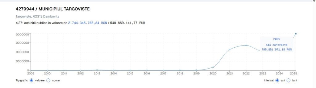 O altă autoritate publică din Dâmbovița, ce derulează proiecte importante cu fonduri publice, atribuite prin lictații, este Primăria Târgoviște, Peste 700 de milioane de lei, în 2025, în 444 de contracte.
