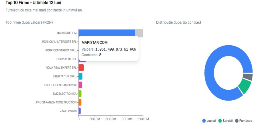 CJ Dâmbovița a împărțit, în 2025, prin intermediul licitațiilor publice din SICAP, suma de 2,7 miliarde de lei, în 582 de contracte. În top 10 al firmelor ce au obținut contracte de la CJ Dâmbovița, se regăesc Maristar Com (peste,1,05 miliarde de lei,în 8 contracte), Roni Civil Interroute și PORR Contsruct SRL, adică firme ce sunt, într-un fel, abonate la banii publici de la CJ DB în fiecare an (vezi mai jos):
