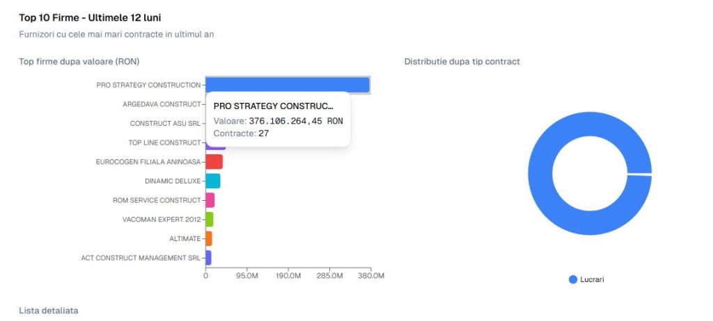 În 2025 (dar nu numai), cei mai mulți bani au mers către PRO Strategy Construct. De fapt, firma amintită a obținut mai bine de jumătate din fondurile atribuite de Primăria Târgoviște, prin SICAP, în anul 2025. Matematic, PRO Strategy a obținut contracte în valoare de 376 de milioane de lei , din totalul de 705 milioane de lei “puși la bătaie” de administrația publică de la Târgoviște, în anul 2025 (conform datelor oferite de agregatorul de date sicap.ai).