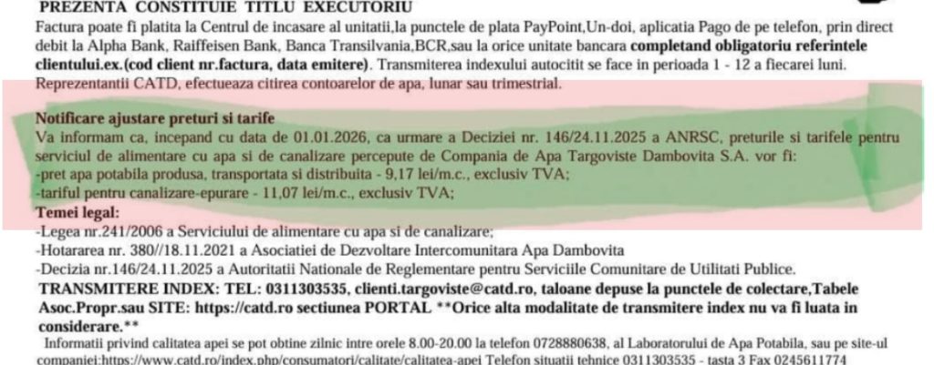 Conform unor notificări, ce deja apar înscrise în facturile emise în decembrie 2025, prețul serviciilor de apă și canalizare a crescut, în Dâmbovița, conform Deciziei nr 146 / 24.11.2025 a ANRSC.
