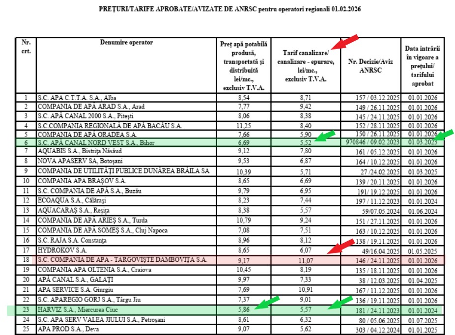 Iată și câteva diferențe subliniate: Cu verde, prețurile practicate de cei doi operatori din județul Bihor (Compania de Apă Oradea SA și SC Apă Canal Nord Vest), ce au, la total (apă potabilă+canalizare), un preț cuprins între 12-13 lei/mc), în vreme ce compania ce operează în Dâmbovița, CATD, are un preț, la total, de 20,24 lei/mc!