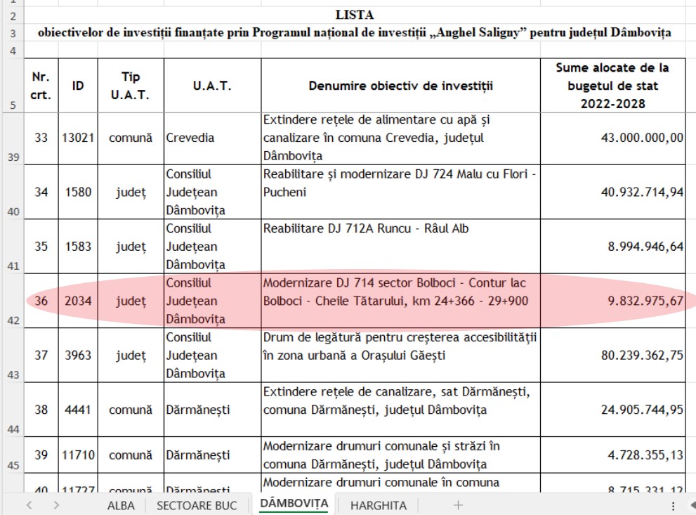 În ziua primelor semnări de alocări, la Ministerul Dezvoltării ( ministerul prin care se alocă banii), Corneliu Ștefan anunța că, practic, primul program din țară ce primește bani este: ,,Modernizare DJ 714 sector Bolboci-Contur Lac Bolboci-Cheile Tătarului’’, un proiect din județul Dâmbovița pentru care se asigura suma de 9,8 milioane de lei.