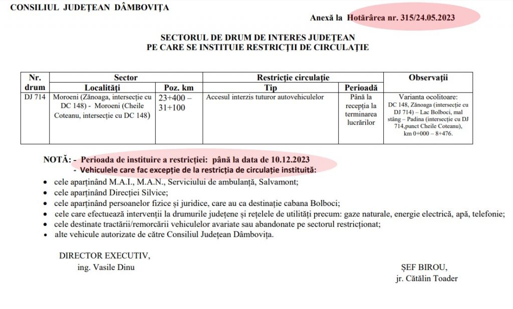 O reacție tot a existat. În data de 24 mai 2023, CJ Dâmbovița a decis închiderea DJ 714, pe exact porțiunea reabilitată prin “Anghel Saligny” ( n.m.:- reabilitare între km 24-30, interdicție între km 23-31, ai drumului) . Mai exact, a impus restricții de circulație auto până în decembrie 2023, având voie să treacă, pe acest drum, doar cei agreați de instituție.( documentul integral mai sus).