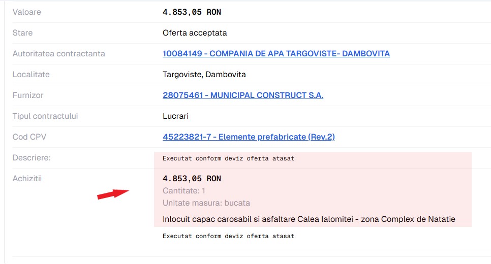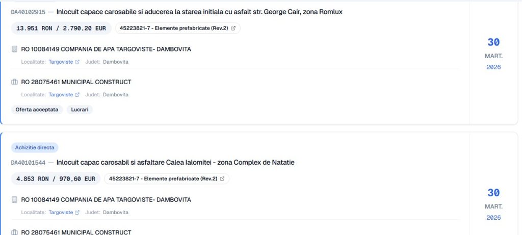 Foto: Afacerea capacul de canal”, așa cum apare în înregistrările din SEAP, din martie 2026